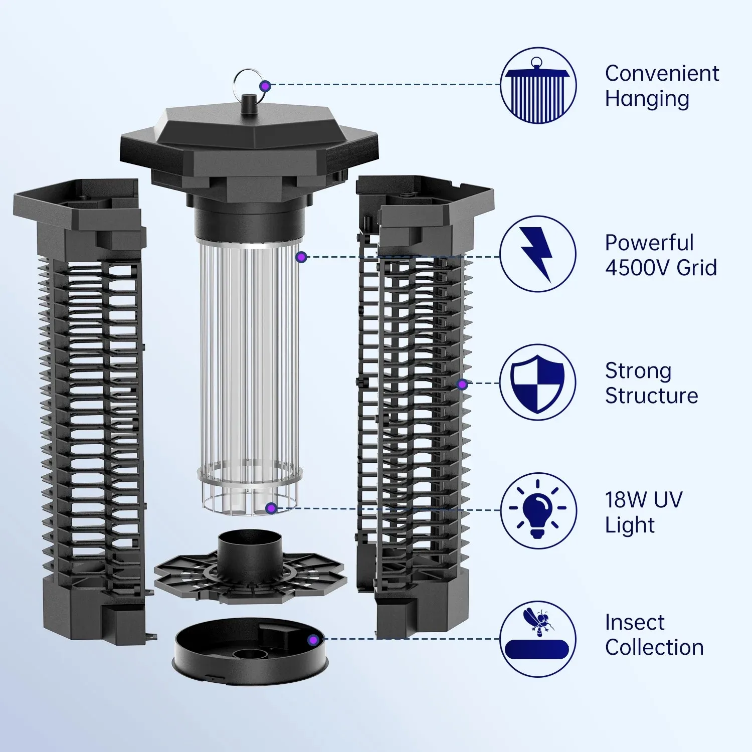 Kloudic efficient bug zapper fly trap keeps you away from mosquitoes. No need for chemicals, safe for humans, pets, and the environment. The protective fenced shell only allows pests to pass, no worry about curious fingers/paw, it is safe for kids and pets. super easy to use, plug and it starts working. The long 5 ft electric wire for flexible setup for both indoor and outdoor 24/7. Super easy cleaning! Insect debris is collected into the bottom tray of this mosquito zapper fly trap, all you need to do is just throwing away the debris and clean the tray (brush included).